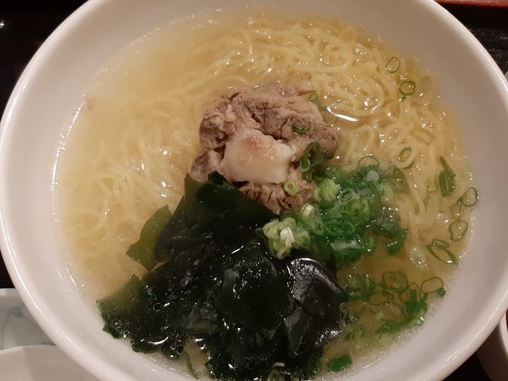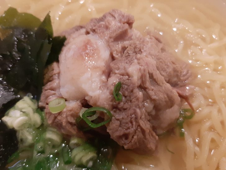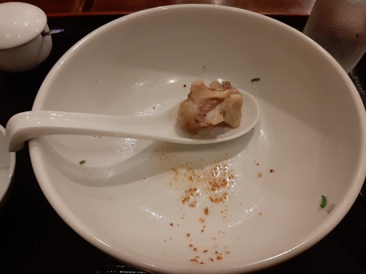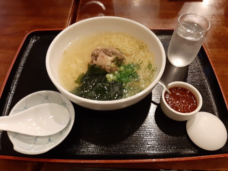 最後の〆には、やはり一番人気の牛テールラーメンを注文しました。具材は、大きめの牛テールのかたまりが真ん中に載っていました。他にワカメとねぎが載っています。また味変用に辛みそが付いてきました。