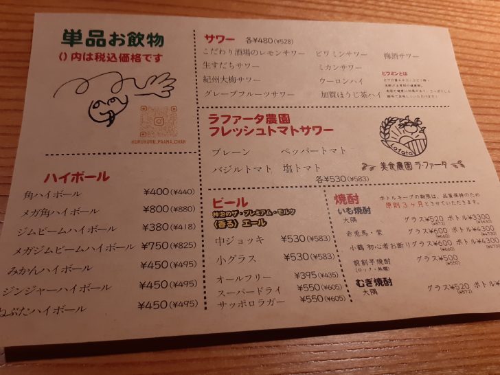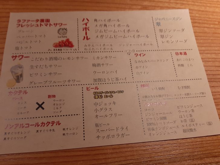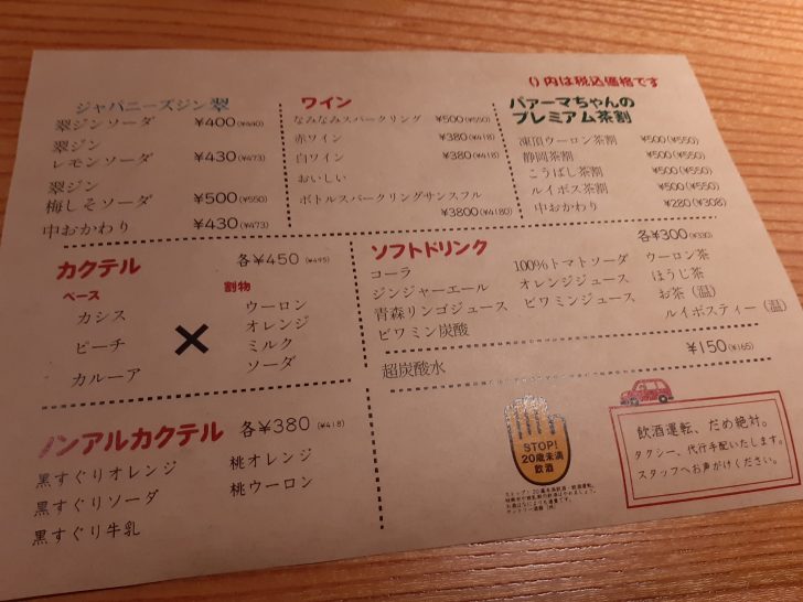 単品のお飲み物のメニュー表です。焼酎のメニューが多いのと、プレミアム茶割というのがありますね。