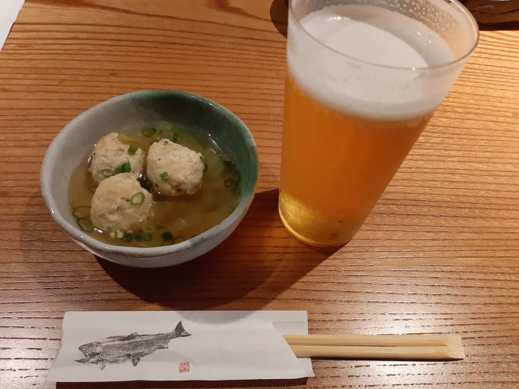 「ビール1杯付飲み放題」は、【1628円(税込)】です。まずは、生ビールを注文しました。それから、お通しは、つみれ汁ですね。【440円(税込)】取られますが、美味しかったです。