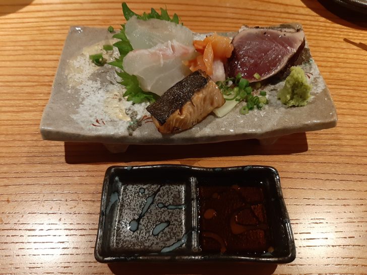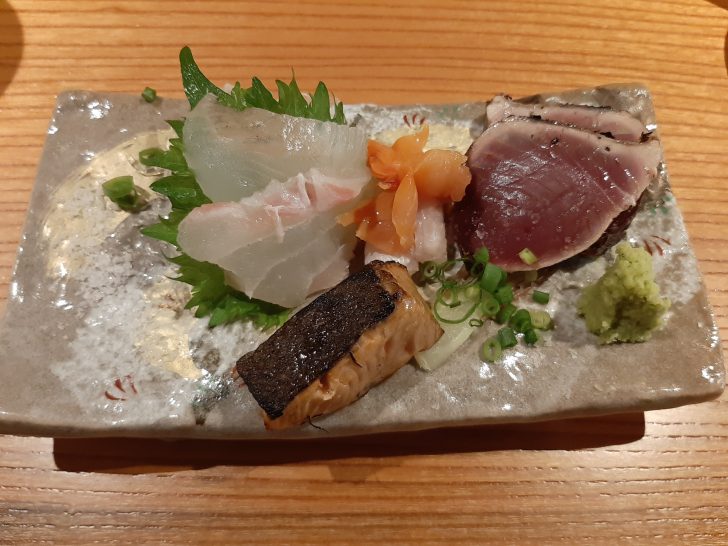 「刺盛1人前」【550円(税込)】を注文しましたが、これが、安くて激旨でした。なんと本日おすすめの刺身(天然クエ、活〆マコガレイ)と赤貝、ワラ焼きで目の前で調理してくれたカツオと宮城サーモンの刺盛でした。どれを食べても旨かったです。こんなに美味しい刺身を食べたのは久しぶりなので、感激しました。