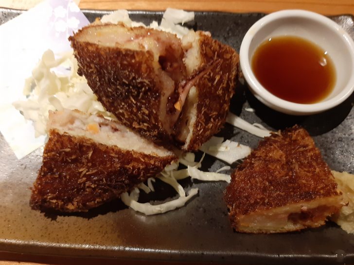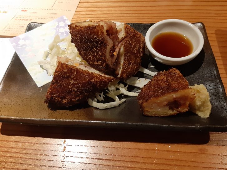 次に「自家製イカメンチ」【605円(税込)】を注文しました。メニューに名物?と書いてあったののと自家製だったので、お店の人に聞いたら、おすすめです。絶対旨いですと言われたので注文しました。生姜醤油で頂きます。