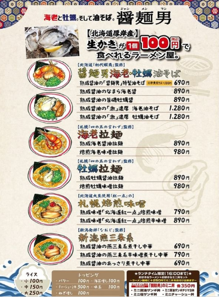 良く分からないんですが、【北海道厚岸産】の生かきが、1個100円で食べられるラーメン屋とのことですが、ラーメン屋で牡蠣を食べなくても良いんじゃないかと思うんですが、牡蠣ラーメンというのであれば分かりますが。