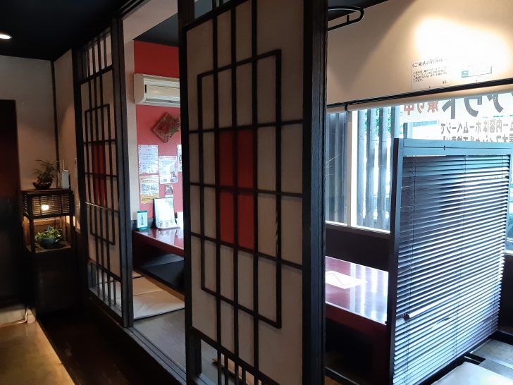 お店は、赤と黒を基調とした内装で落ち着いた雰囲気で良いですね。席はテーブル席と掘りごたつ席が全部で32席ほどあるので、ランチにも、ディナー、宴会にも対応できますね。