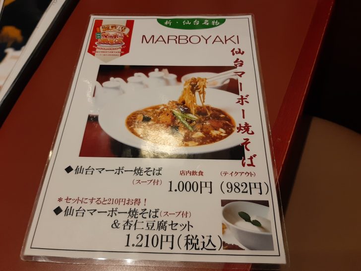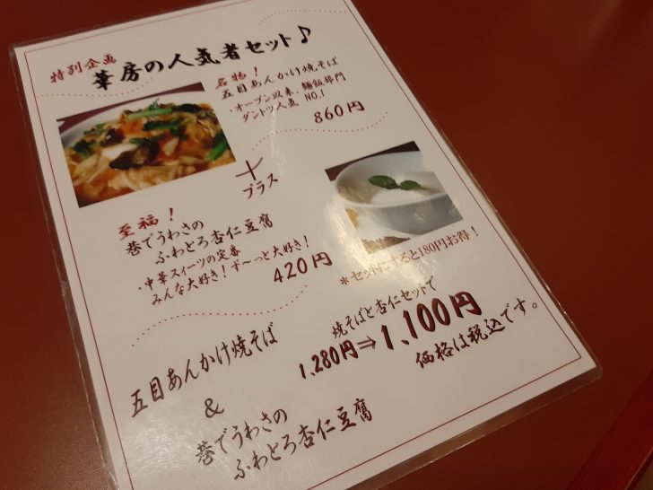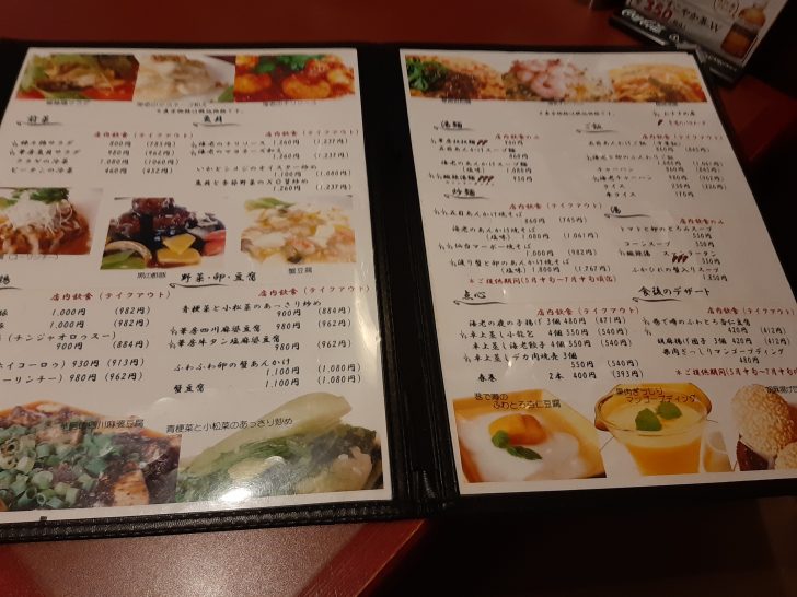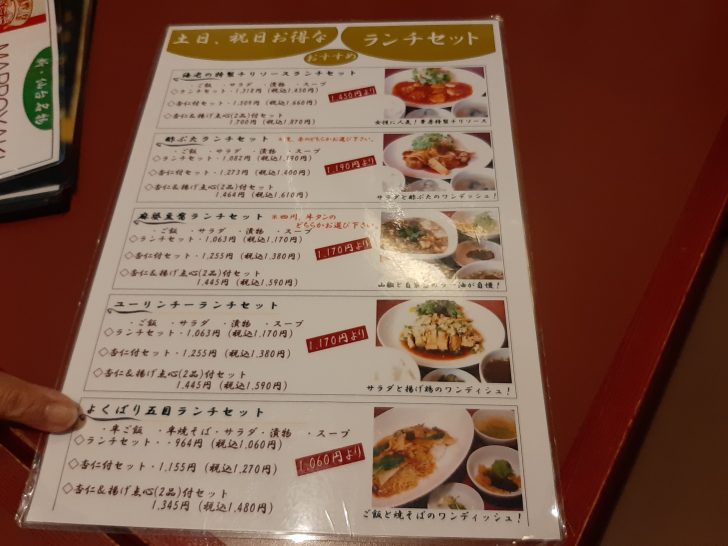 メニューには、定食類、飯類、麺類、セット類、点心類、一品料理、飲み物と一通りの中国料理メニューがありますね。こちらは土日・祝日のお得なランチセットですね。平日のランチセットに比べて若干高めですね。