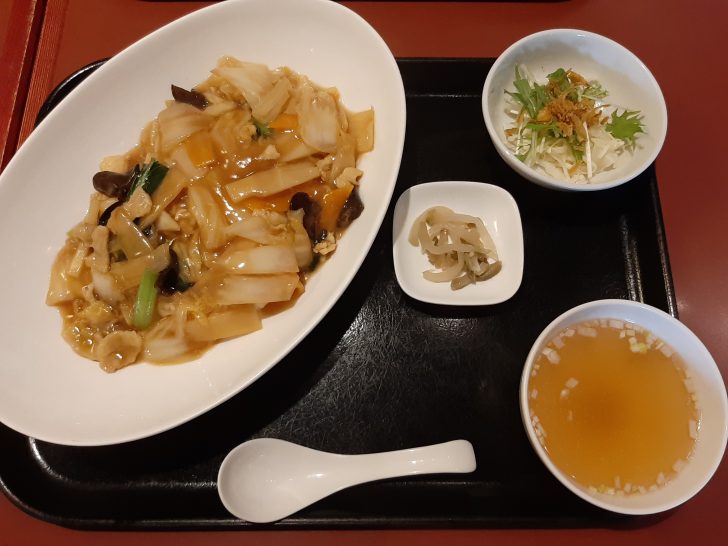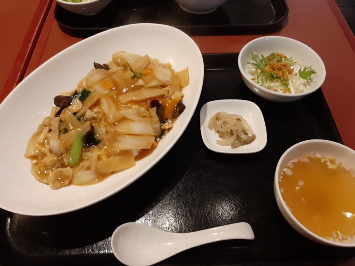 かみさんが注文したのは、「よくばり五目ランチセット」です。餡かけは、具だくさんでは、ありますが、野菜(特に白菜)が、多いように思えました。の餡かけやきそばですね。普通盛りなのですが、ボリューム満点で、味付けも良く美味しくいただけました。麺には焦げ目がついていて香ばしいですね。