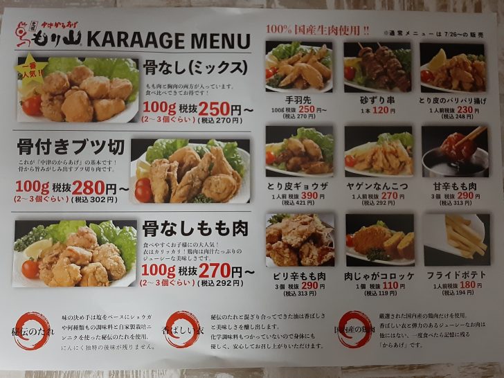 これが、元祖『中津からあげ もり山』仙台泉店のからあげメニューです。