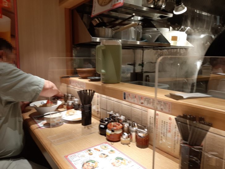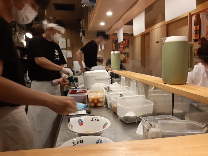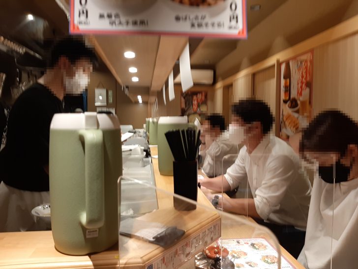 お店はカウンターのみですね。隣席とは、アクリル板で仕切られていて、コロナ感染対策も万全ですね。