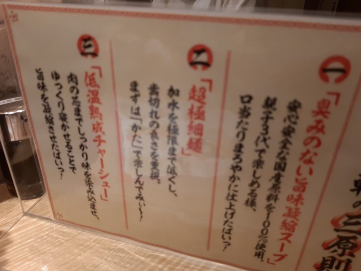 ラーメンの種類は、とんこつラーメン、屋台ラーメン、焦がしとんこつラーメンの3種類で、後はトッピングがあります。麺の硬さは4種類。サイドメニューは、ひとくち餃子、明太子ご飯、炙りチャーシュー丼、ライス、後はドリンクですね。