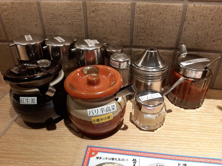 卓上調味料はたくさんあります。紅生姜、バリ辛高菜、にんにく、醤油、酢、ラーメンたれ、胡椒、ごま、にんにくラー油などですね。