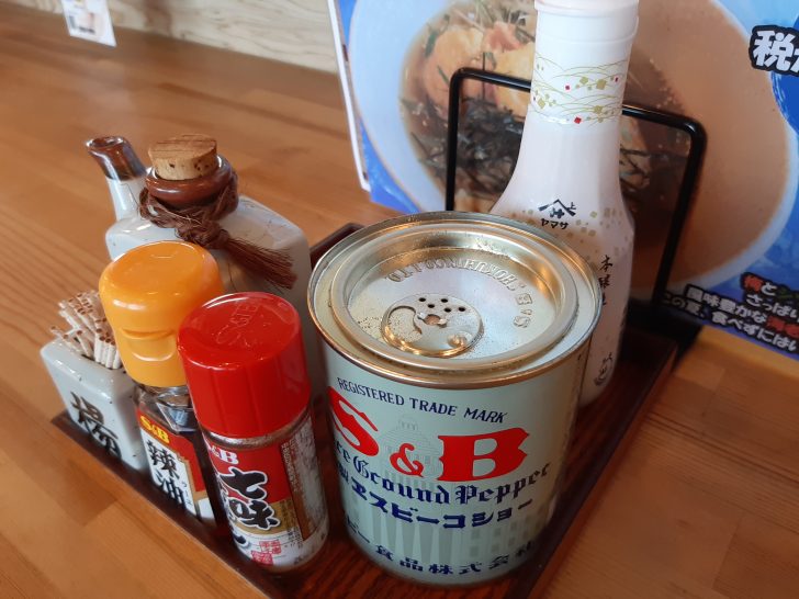 卓上調味料は、でっかい胡椒、醤油、ラー油、七味唐辛子ですね。