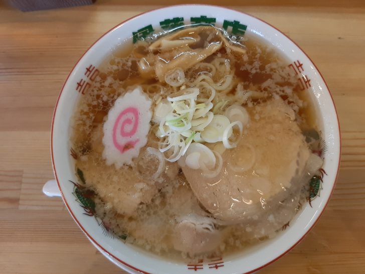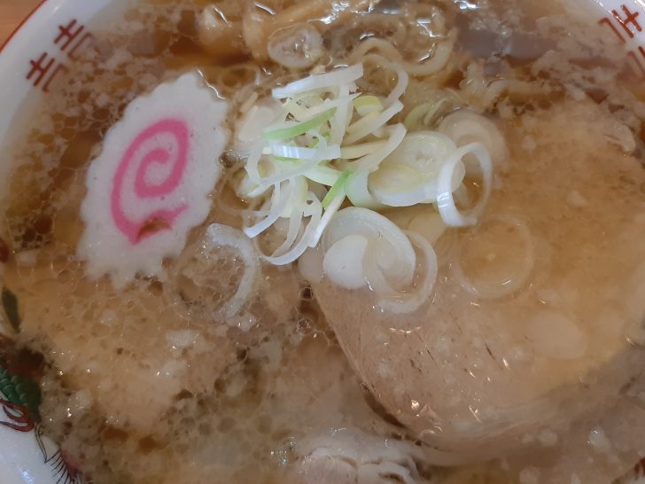 今回は「中華そば」を注文しました。具材は、チャーシュー2枚、ナルト、メンマ、ネギですね。この値段で大きめのチャーシューが2枚も入っていて、お得ですね。後は背脂が多めです。
