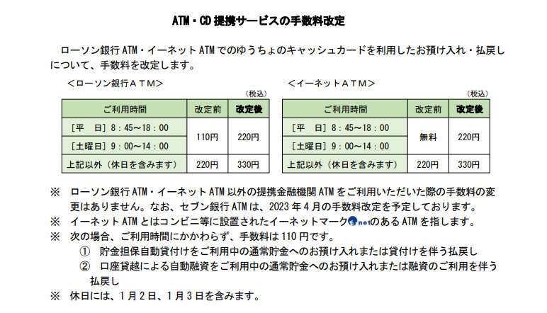 ローソン銀行ATM、イーネットATMでのゆうちょカードによる預け入れ・払い戻しの手数料が改定されます。(セブン銀行ATMは、2023年4月に料金改定の予定)