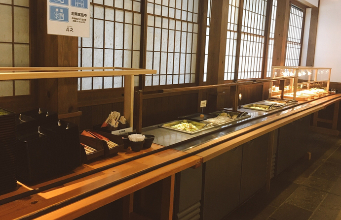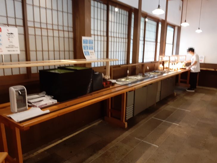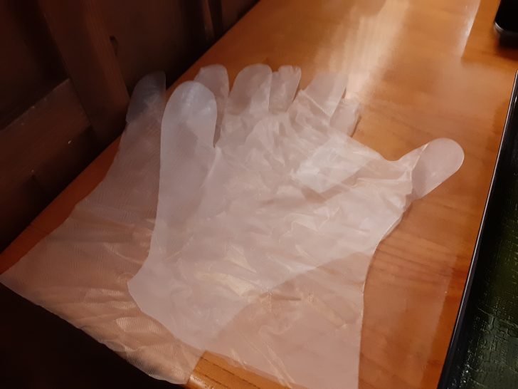 支払いを済ませると、バイキングスタイルのようなセルフサービスへ進みます。まずは、使い捨てのポリ手袋の装着が必須となります。