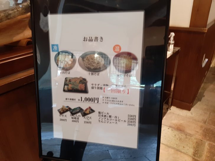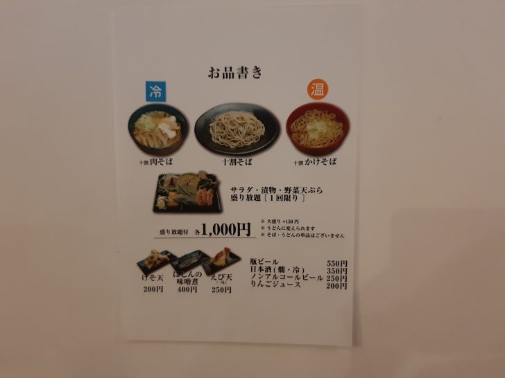 お品書きは、こちらのみです。まず麺を3種類【(冷)十割肉そば・十割そば・(温)十割かけそば】から選びます。これには、サラダ・漬物・野菜てんぷらの盛り放題が付いて【1,000円(税込)】となります。麺の大盛りは+150円、そばは、うどんに変更できます。他のトッピングメニューとしては、げそ天【200円】、にしんの味噌煮【400円】、えび天【250円】があります。他のサイドメニューとしては、ドリンクメニューのみとなります。