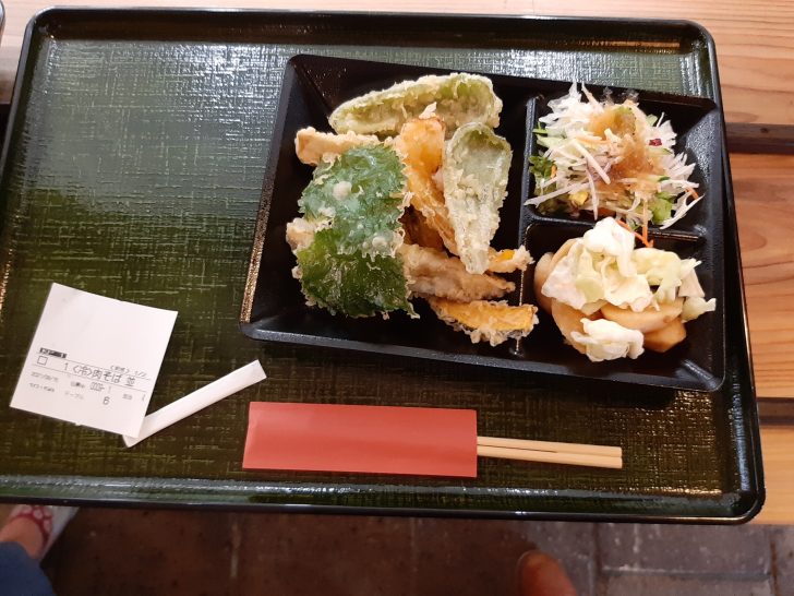 次にお盆に取皿、割り箸などを載せて、サラダ、漬物、野菜てんぷらの順番で取っていきます。