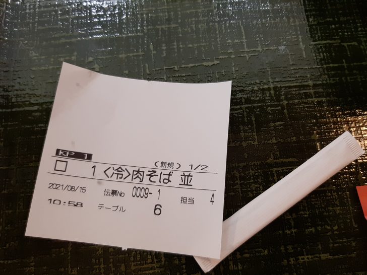 料金を払うとこのようなレシートが貰えます。これは、「肉そば並」とテーブルは、NO6となっていますね。