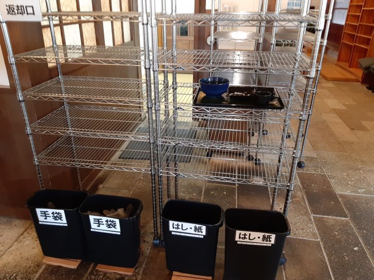 食べ終わったら、この返却口に返却します。手袋、はし・紙などは分別して捨てます。