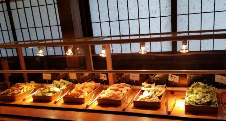 野菜てんぷらは、かぼちゃ、ピーマン、パプリカ、にんじん、なす、大葉と夏野菜がたくさん並んでいます。これは、1回限りの盛り放題です。