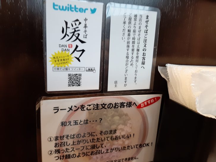 『中華そば煖々』のおすすめは、「和え玉」のようです。のり和え玉と辛み和え玉の2種類あります。250円で、そのまま食べても良いし、残ったスープにつけて食べるのも美味しいらしいです。 次回は注文してみたいです。