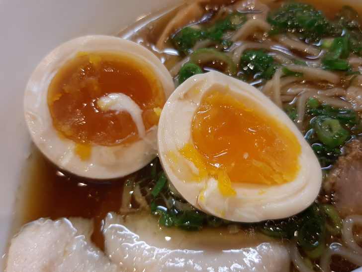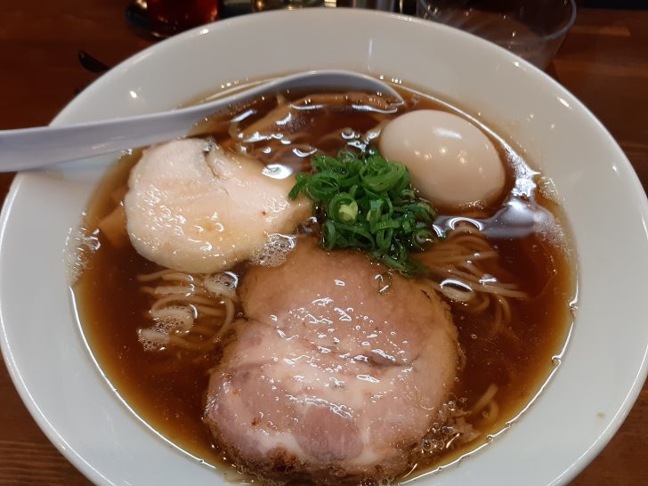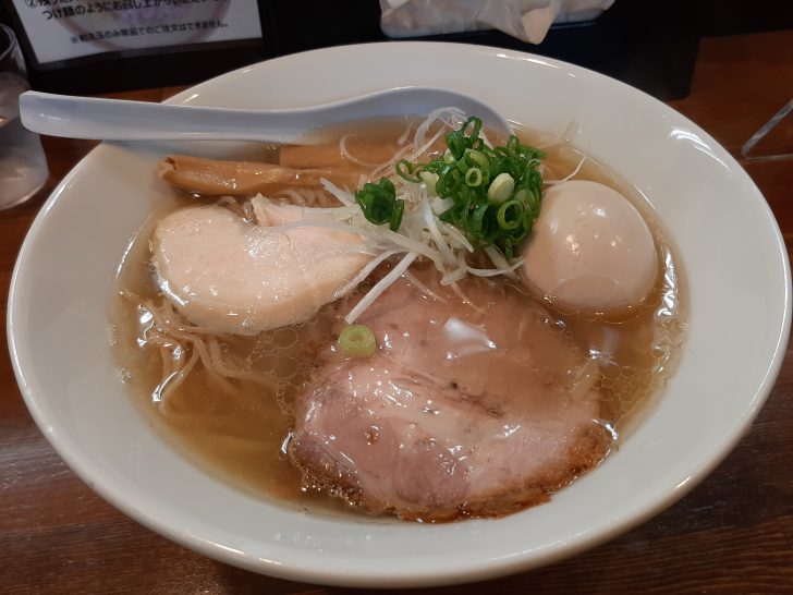 これが「味玉醤油そば」ですが、具材は、チャーシュー2枚(豚肉と鶏むね肉)、味玉、メンマ、ネギですね。