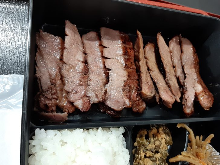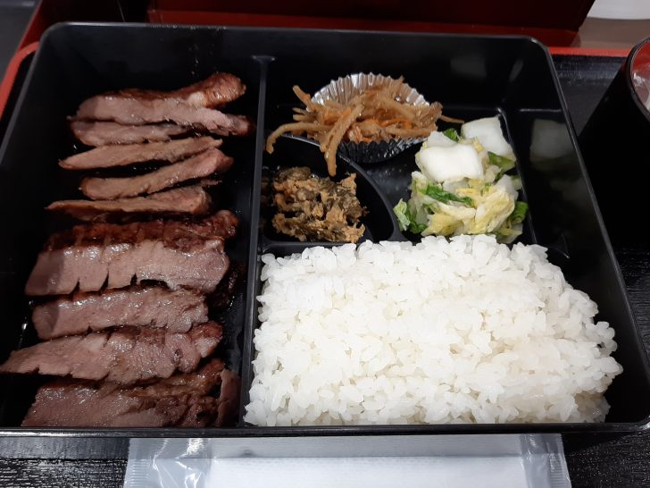 牛タンステーキは厚さ12mmあります。副菜として、白菜漬け、南蛮味噌漬け、きんぴらごぼうが付いて来ます。御飯は、無料で大盛にもできます。