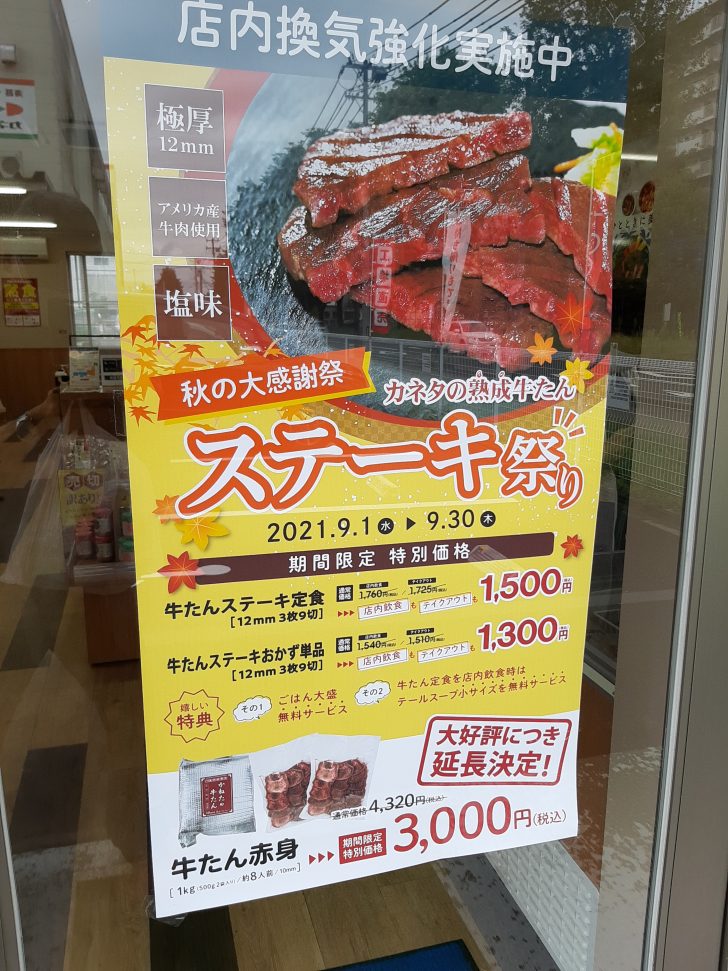2021年9月はカネタの熟成牛たん『ステーキ祭り』が開催されています。期間限定で牛たんステーキ定食と牛たんステーキおかず単品が、特別価格で提供されます。