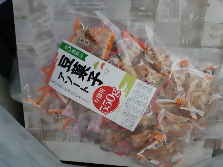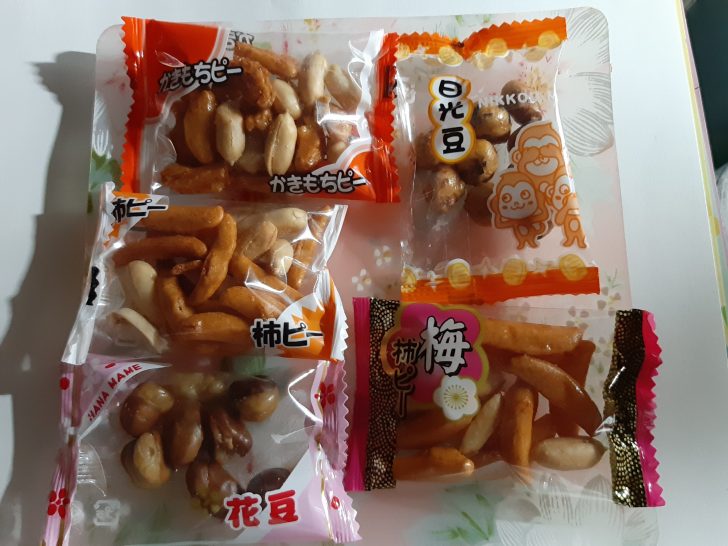 次のような5種類の豆菓子が、たくさん入っています。普通に美味しいです。