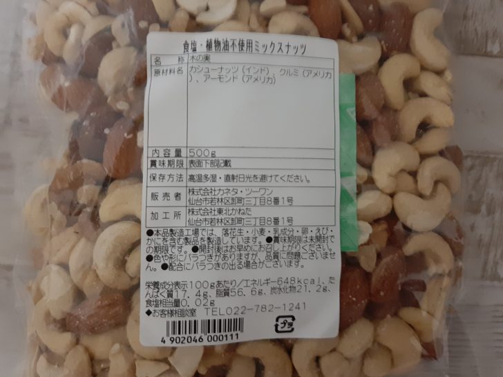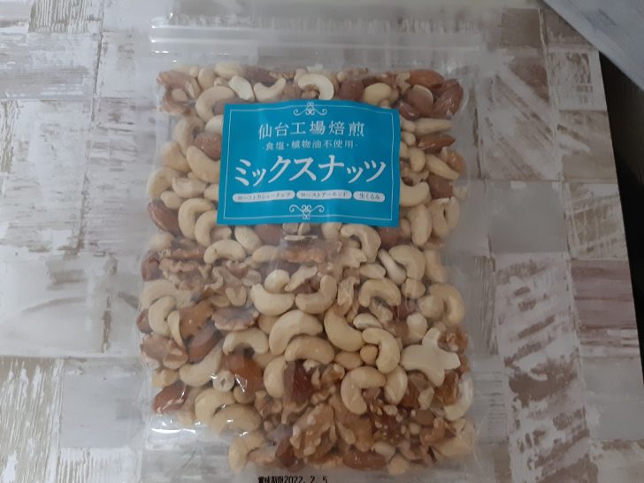 食塩・植物油不使用の『ミックスナッツ』は、カシューナッツ、クルミ、アーモンドの3種類が入っていて500gで648円(税込)と激安です。【648円(税込)⇒700円(税込)値上げ】となりました。これまでは、通販の方が安かったので購入していましたが、ここの『ミックスナッツ』は、工場直売で、出来立てなので、美味しいんです。