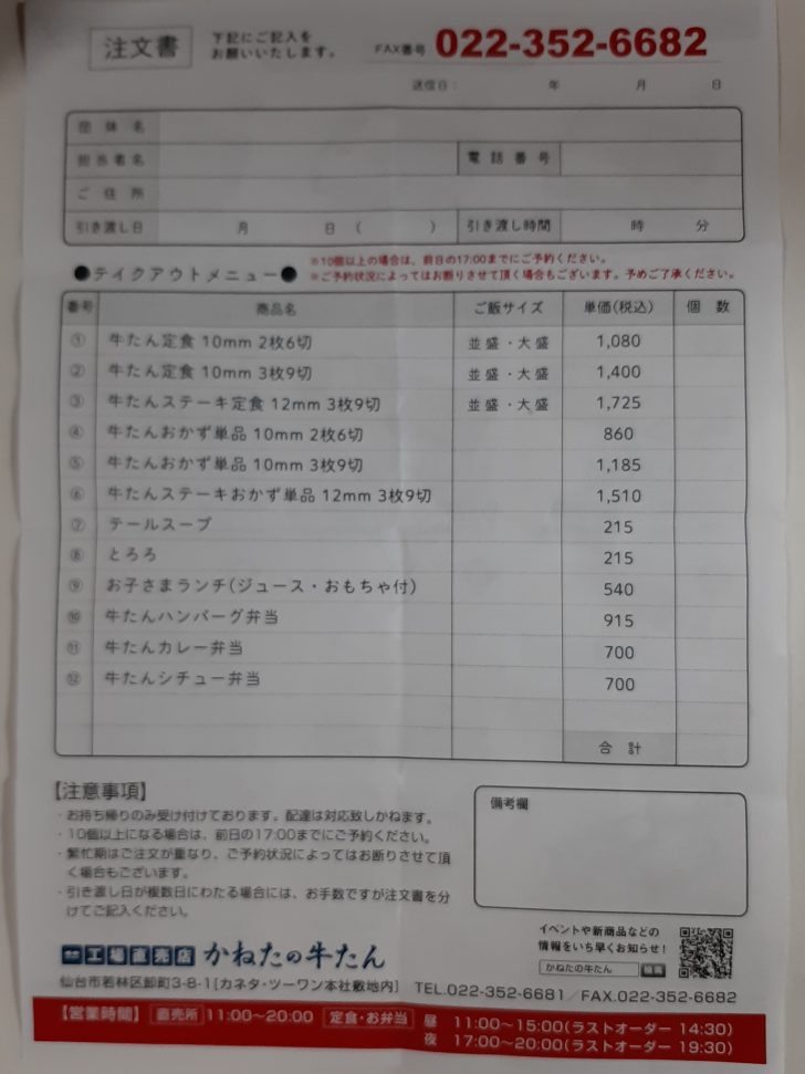 テイクアウトメニューです。電話&FAXでも注文を受付しています。