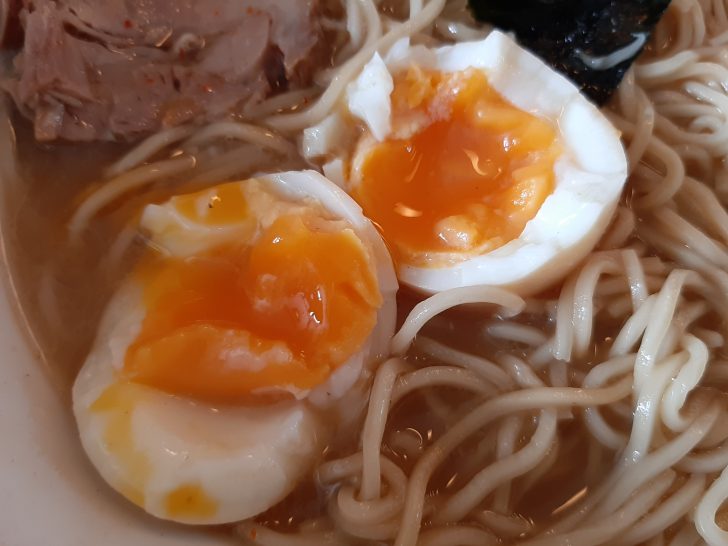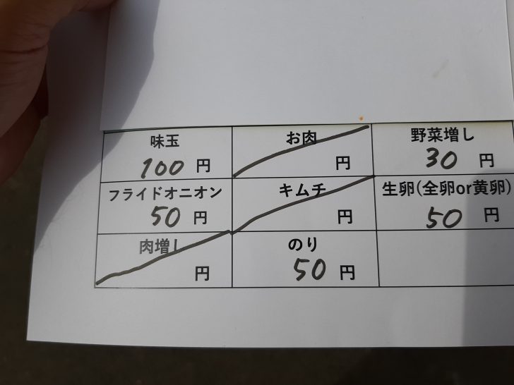 具材は、チャーシュー1枚、メンマ、ねぎ、のりです。他に追加トッピングの味玉があります。