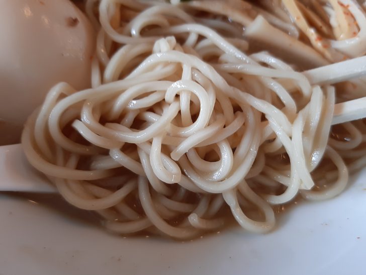 自家製麺の細麺は、パッツン系で、コシもあり、ストレート麺で美味しかったです。