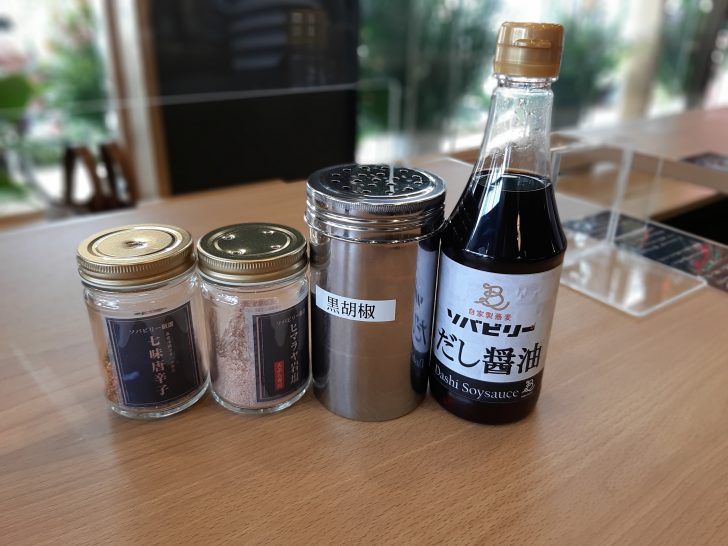 卓上調味料は、七味唐辛子、ヒマラヤ岩塩、黒胡椒、だし醤油です。