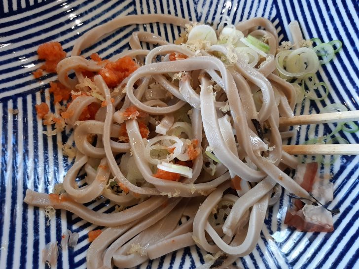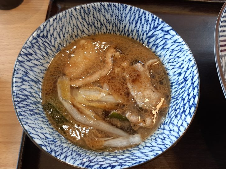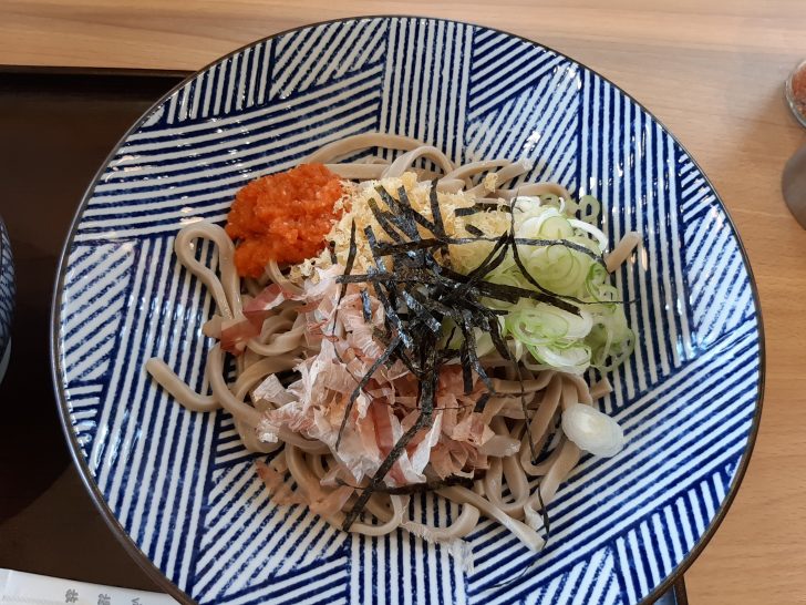 つけそばには、もみじおろし、かつお節、天かす、ねぎ、のりが載っていました。極太のそばはコシがあって食感は良いです。しかし、あまりそばの香りや風味は感じられなかったですね。