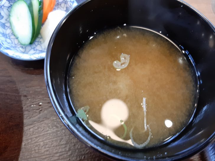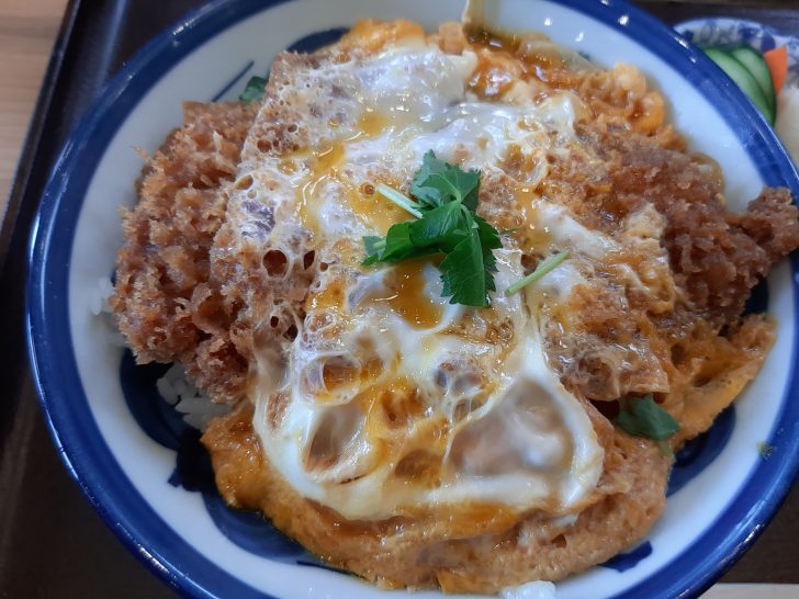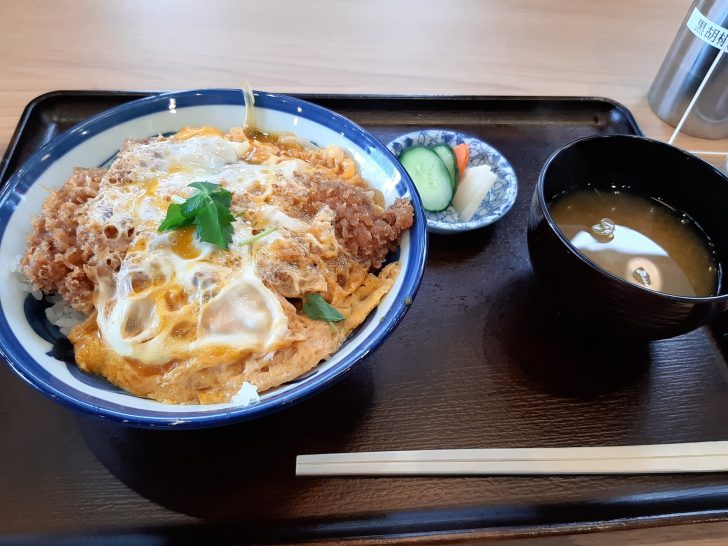 これが、娘が注文したかつ丼ですが、かなりのボリュームがありました。漬物とみそ汁がついています。