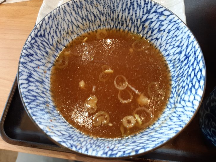 「つけそば」のつけだれは、温かい醤油たれです。具材は、豚肉、ネギですね。もみじおろし等をタレに入れたら、結構辛さが効いて、私の好きなタイプのたれでした。