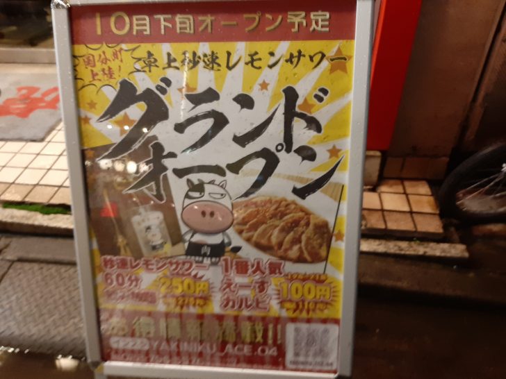 60分飲み放題は安くて良いのですが、焼肉は高くなるので、ちょい吞みには向かないかな?というのが私の感想です。それよりも飲み放題付きのコースにすればお得に飲めそうですね。ただグランドオープン時には、えーすカルビ100円、レモンサワー飲み放題250円になるようなので、お得に飲めそうですね。