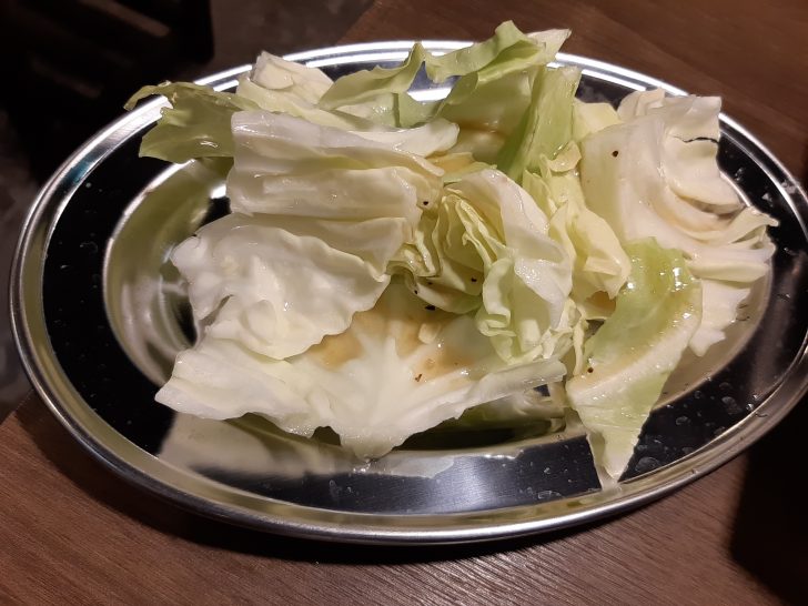 今回は、卓上!!秒速レモンサワー60分飲み放題500円+500円【1,100円(税込)】でプレミアム飲み放題にしました。お通しは塩ダレがかけてあるキャベツ盛ですね。お通し代金は¥330です。