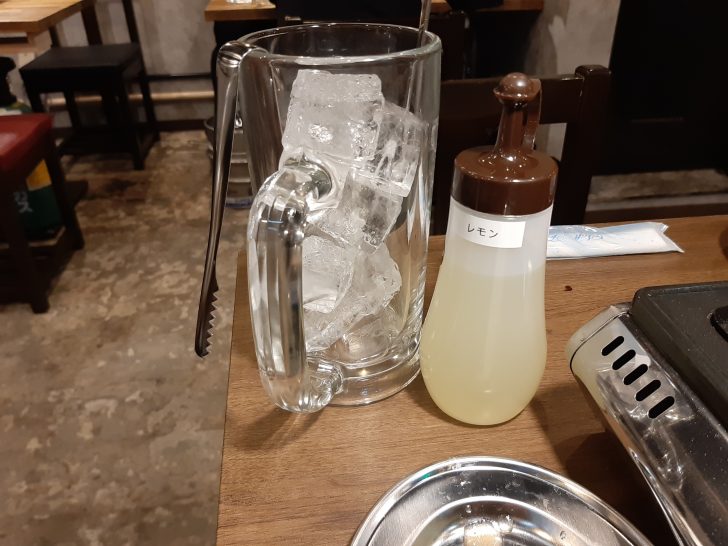 大ジョッキで氷が提供されます。レモンが足りない場合は、卓上に用意されているレモン果汁を入れます。