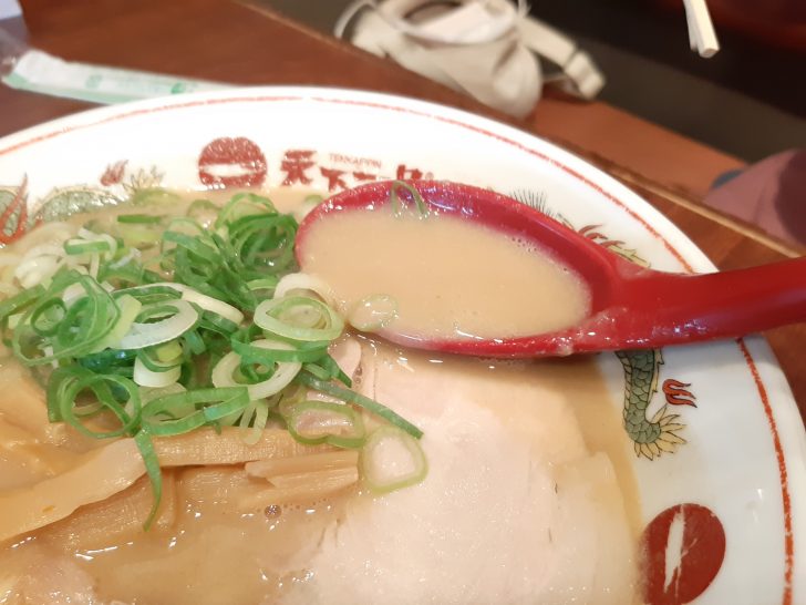 こちらが、かみさんが注文したお店の一番人気の看板メニューの「天下一品ラーメン」ですね。具材はチャーシュー1枚、メンマ、ネギとシンプルですね。