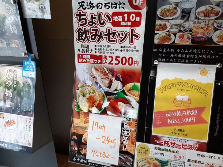 仙台駅西口にある奥州魚河岸酒屋『天海のろばた本店』のちょい呑みセットは【2500円(税込)】で料理5品と1時間飲み放題(地酒10種も飲める)と、とっても美味しくてお得だったので紹介します。