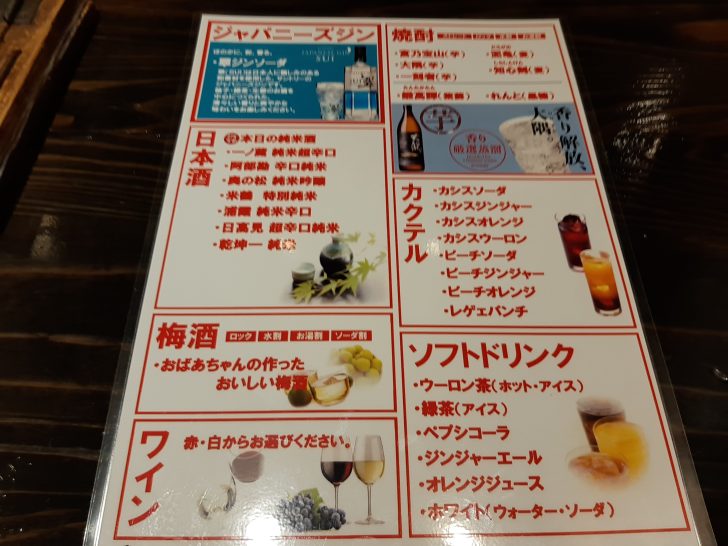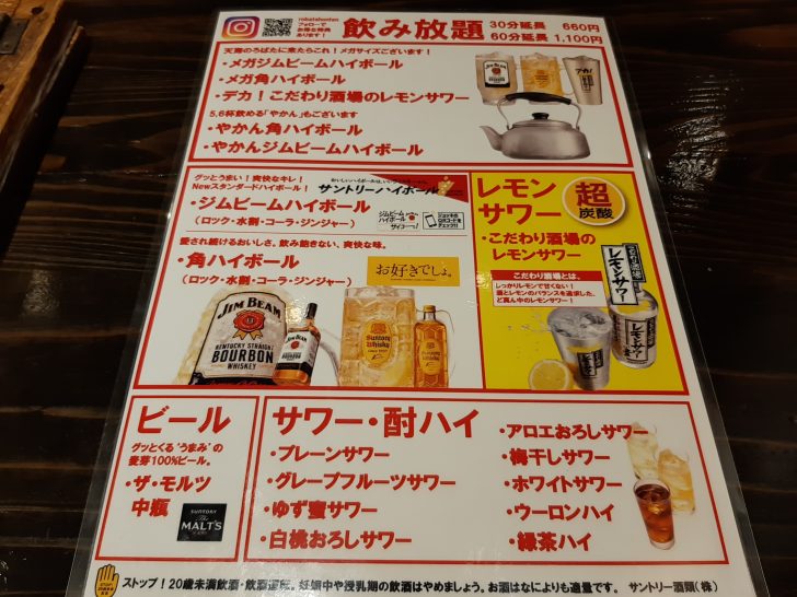 これが飲み放題のドリンクメニューです。ビール、ハイボール、サワー、焼酎、ジン、ワイン、日本酒が飲み放題です。ビールは瓶ビールのみです。