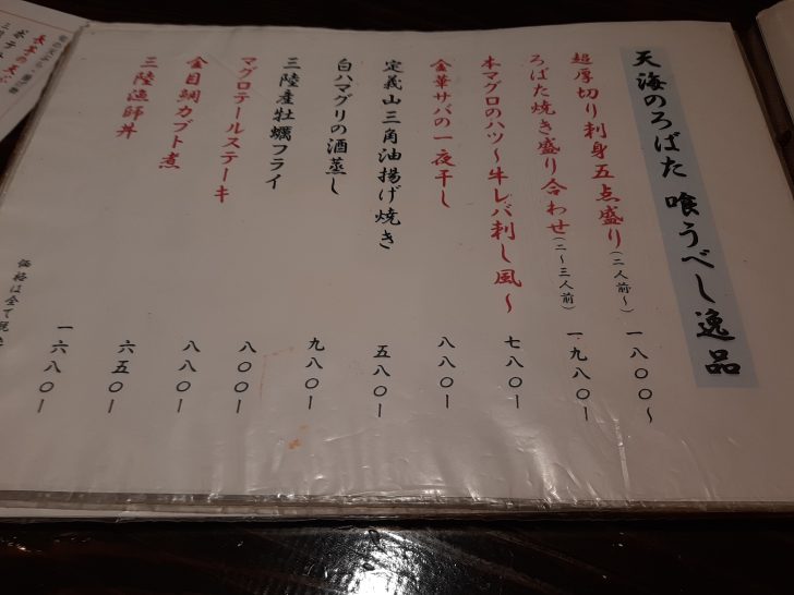 奥州魚河岸酒屋『天海のろばた本店』のメニュー