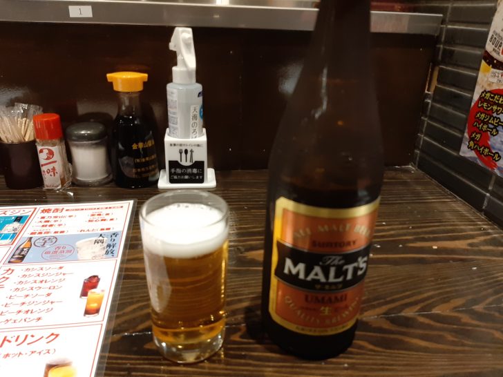美味しそうなおつまみメニューが、たくさんありましたが、今回のお目当ては「ちょい飲みセット」なので、早速注文しました。平日限定ですが、料理5品付+1時間飲み放題付き(地酒10種飲める)で、【2500円(税込)】というのは安いですね。最初は瓶ビール(サントリーモルツ中瓶)を注文しましたが、良く冷えていて、旨いですね。ちなみに、このお店では、飲み放題のビールは生ビールではなく、瓶ビールとなります。