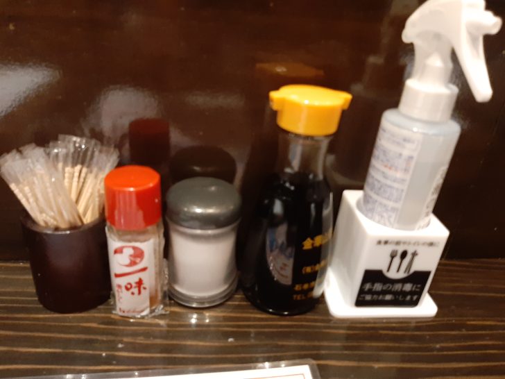 机上の調味料は、一味唐辛子、塩、醤油ですね。それに消毒用アルコールが置いてあります。