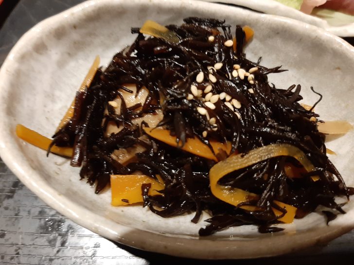 料理は、すぐに3品が提供されました。刺身3点盛(鯛、ぶり、まぐろ)、本日の一品(ひじきの煮物)、自家製いかの塩辛です。