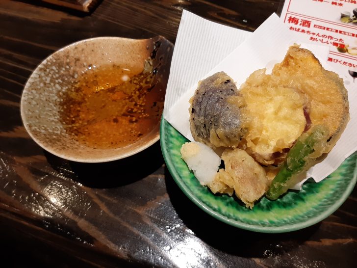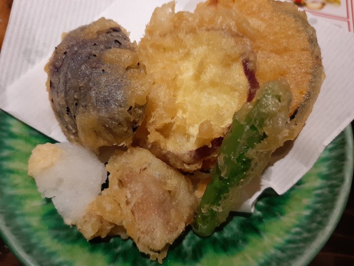 5品目は本日の揚げ物です。今日は野菜の天ぷらです。なす、さつまいも、かぼちゃ、長芋、シシトウと、これも美味しいです。