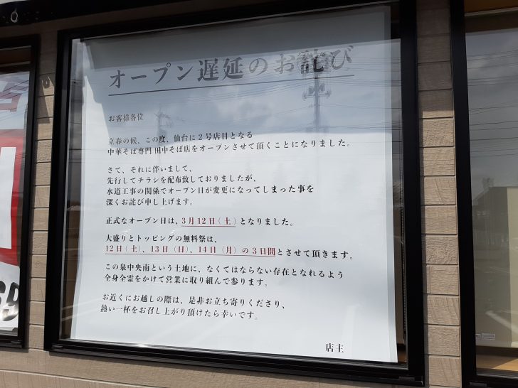 オープン日が延期となった理由は、水道工事のトラブル?のようです。尚、オープン3日間は、大盛トッピング無料祭が行われるようです。