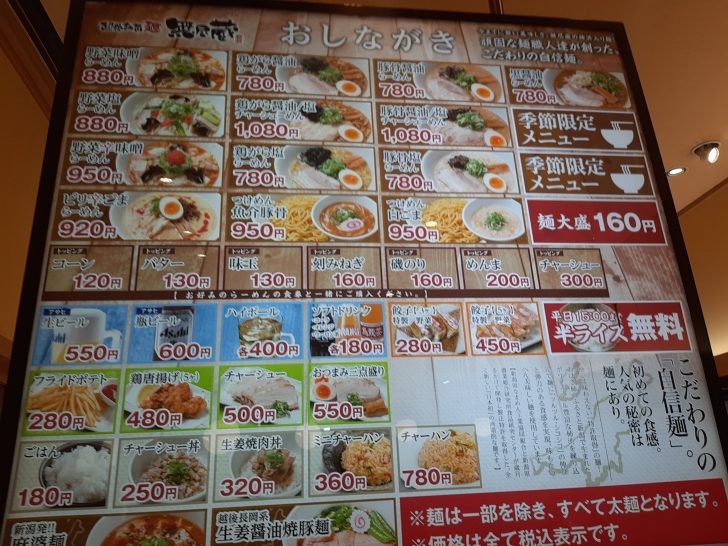 越後秘蔵麺『無尽蔵』では「野菜味噌らーめん」と「豚骨醤油らーめん」が看板メニューのはずだと思いますが、「野菜塩らーめん」というのも看板メニューになりつつあるんですかね?メニューの写真が一番大きくなっていました。