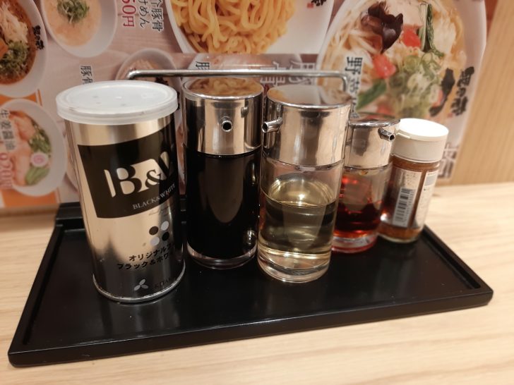 卓上調味料は、ブラックペッパー、醤油、酢、ラー油、唐辛子です。