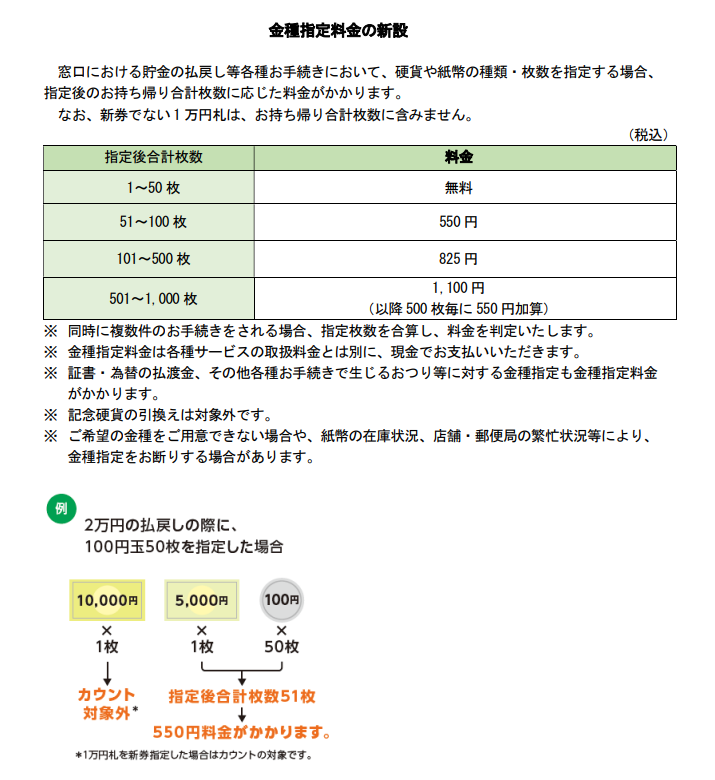 郵便局の貯金の払戻し等で、金種を指定する場合も、現状は、手数料は無料ですが、2022年1月17日よりは、次の通り有料になるようです。ここでは、硬貨だけでなく紙幣も一部対象になるようですので、注意が必要です。新券でない1万円に関しては、合計枚数に含まれないようですが、新券の場合は、合計に含まれるようです。ということは、結婚式のお祝いなどで、新券での払戻しをお願いする場合は、51枚以上は手数料が掛かるということですね。